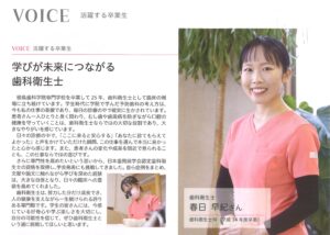 メディア掲載 2026.03.23 徳島歯科学院専門学校のパンフレットに掲載されました 成人予防部の春日早紀が徳島歯科学院専門学校のパンフレットに、「活躍する卒業生」としてインタビューされ、記事が掲載されています。
